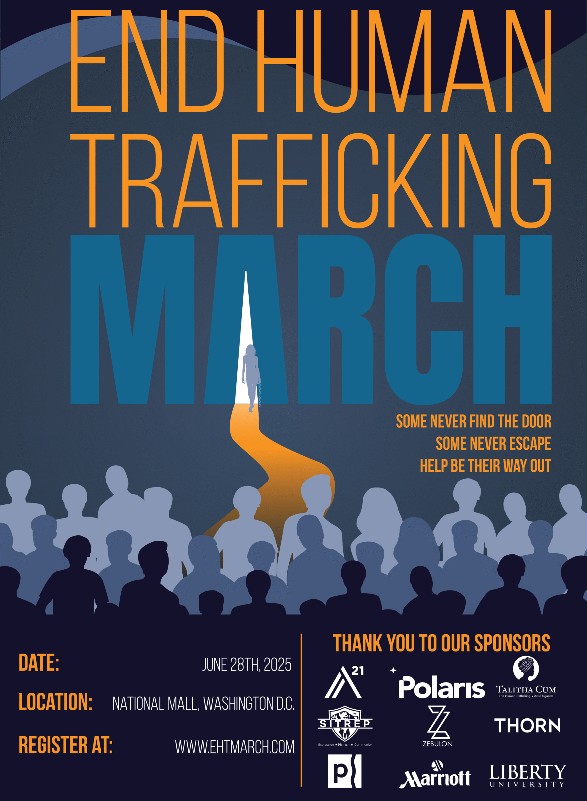 In the second design I leaned into illustration. A simplified version of the same concept shows a silhouetted figure walking through the A shaped doorway leaving a glowing path behind her. The surrounding crowd stylized and abstract represents the growing awareness and movement in support of ending trafficking while also representing those who may never escape or be found.