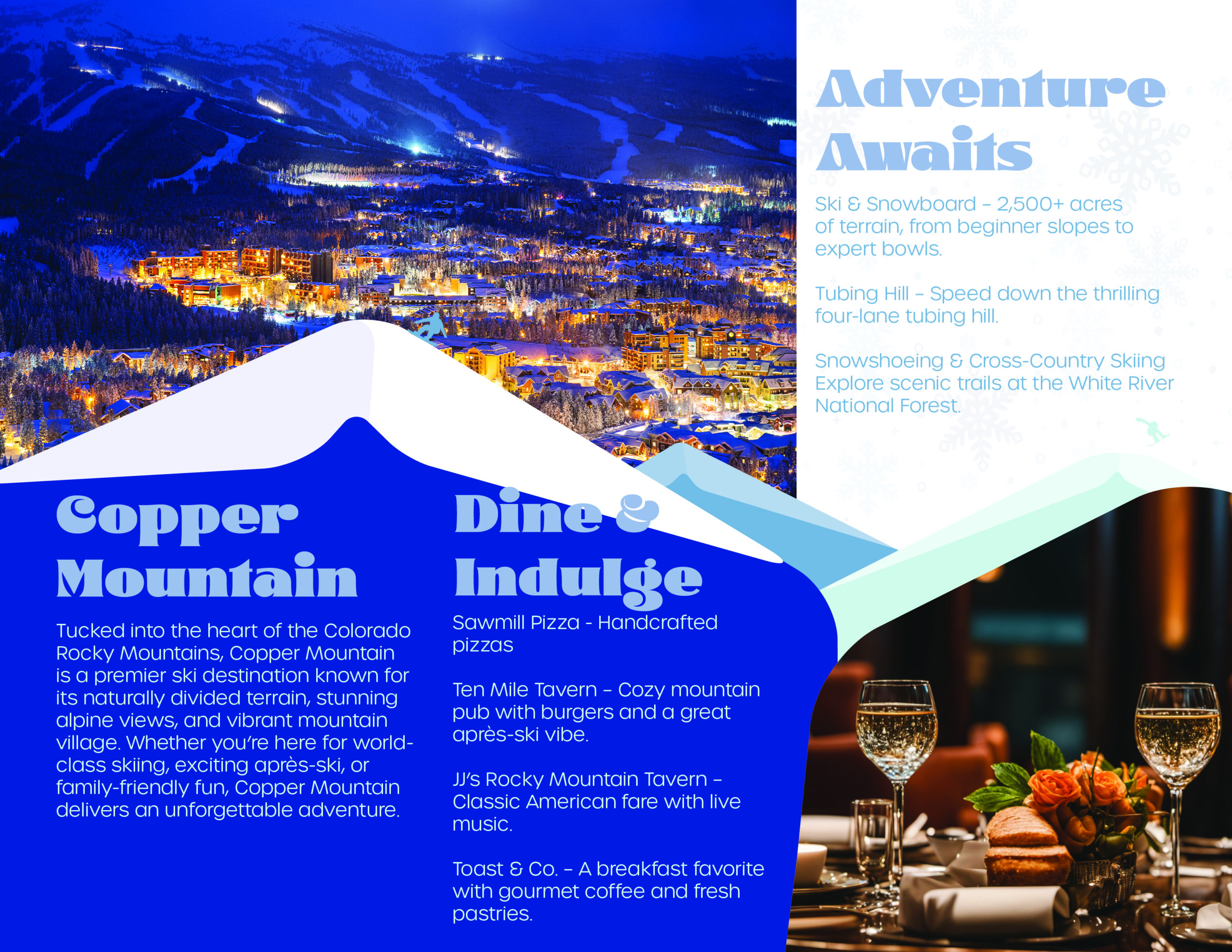 For this school project, I designed a trifold brochure for Copper Mountain, a ski town in the middle of Colorado. The goal was to create something that felt exciting yet informative, something that would make you want to grab your gear and head for the mountains. While also giving enough information to plan a getaway trip.